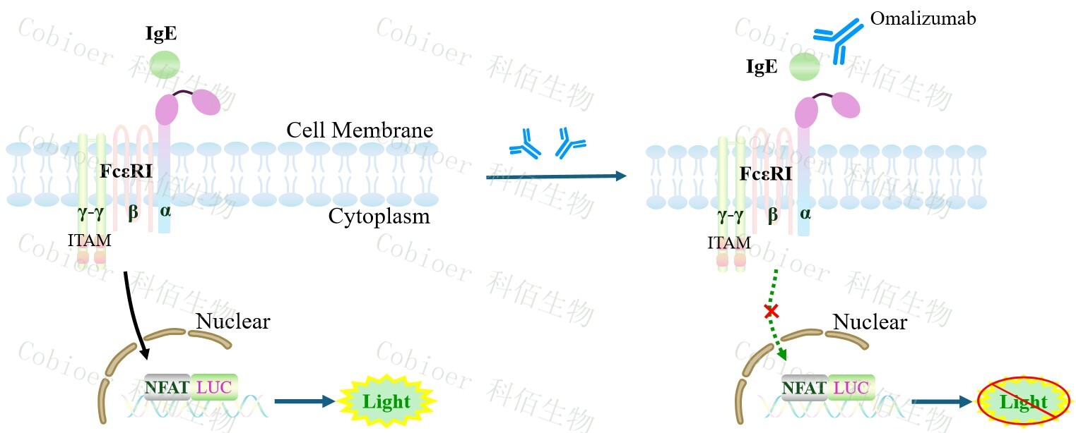 FcεRI Effector Reporter Cell 藥靶模型很好的模擬了 FcεRI的信號轉導過(guò)程,原理見(jiàn)下圖所示。