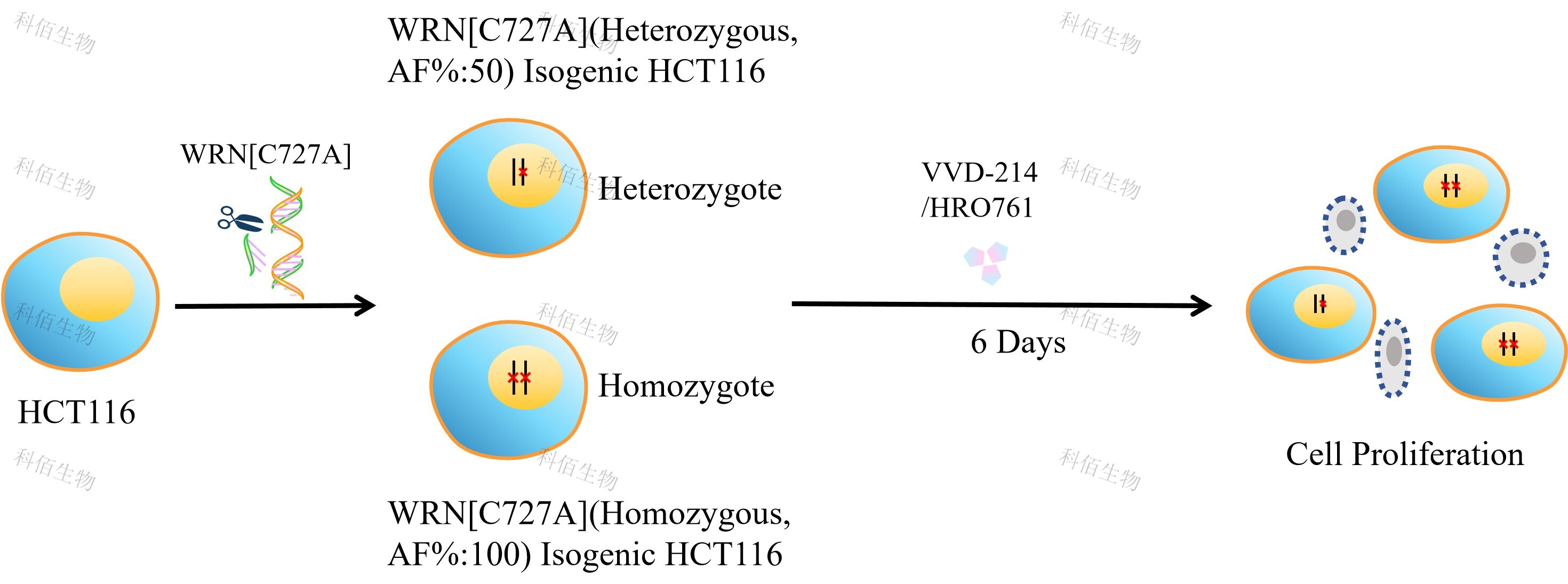 WRN[C727A](Homozygous,AF%:100) Isogenic HCT116 藥靶細胞,通過(guò) 基因編輯的方式將 WRN 的 727 位氨基酸胱氨酸(C)突變?yōu)楸彼幔ˋ)。![]() Figure 1. WRN[C727A](Homozygous,AF%:100) Isogenic HCT116 原理示意圖 |