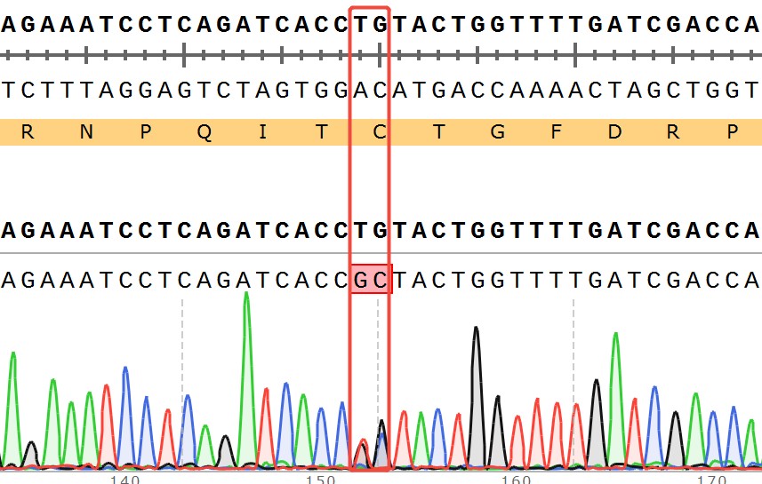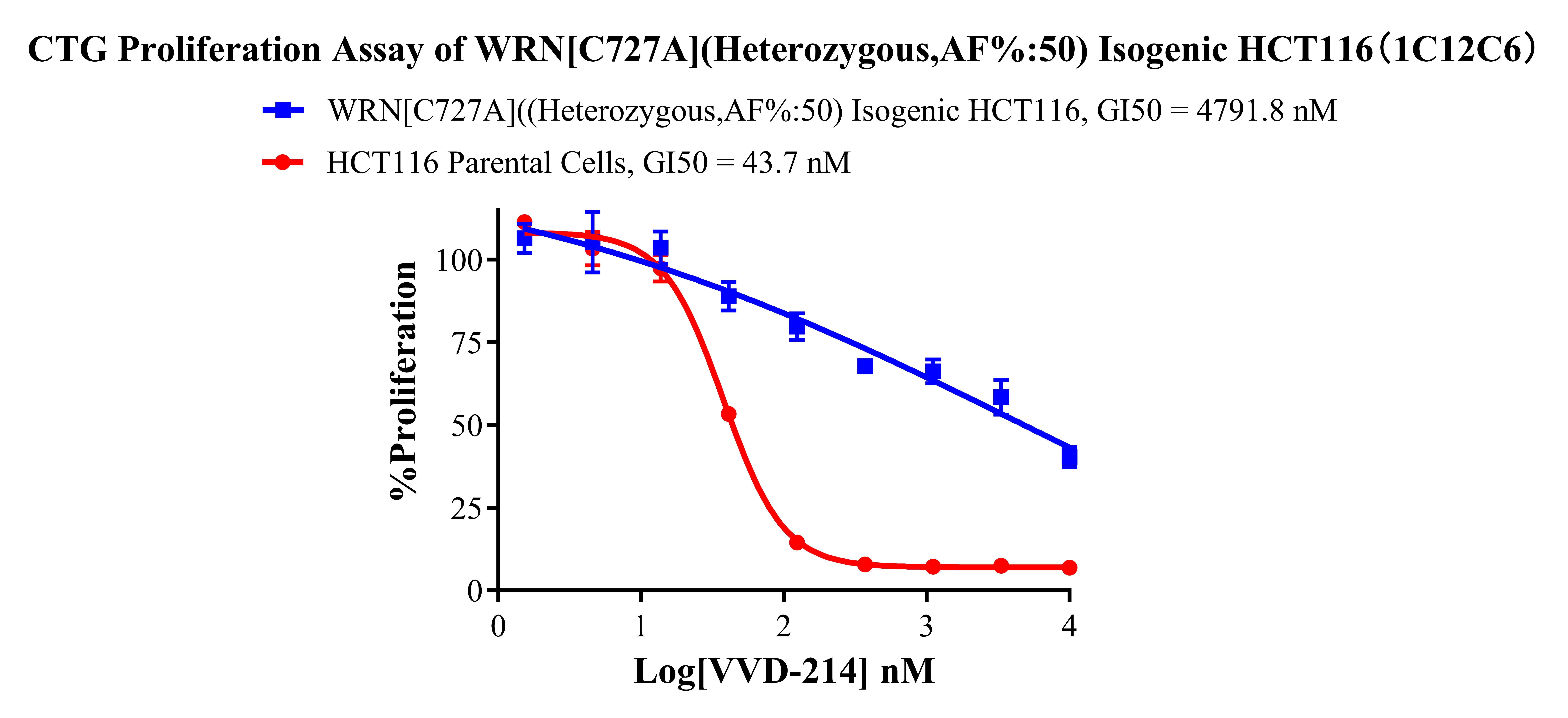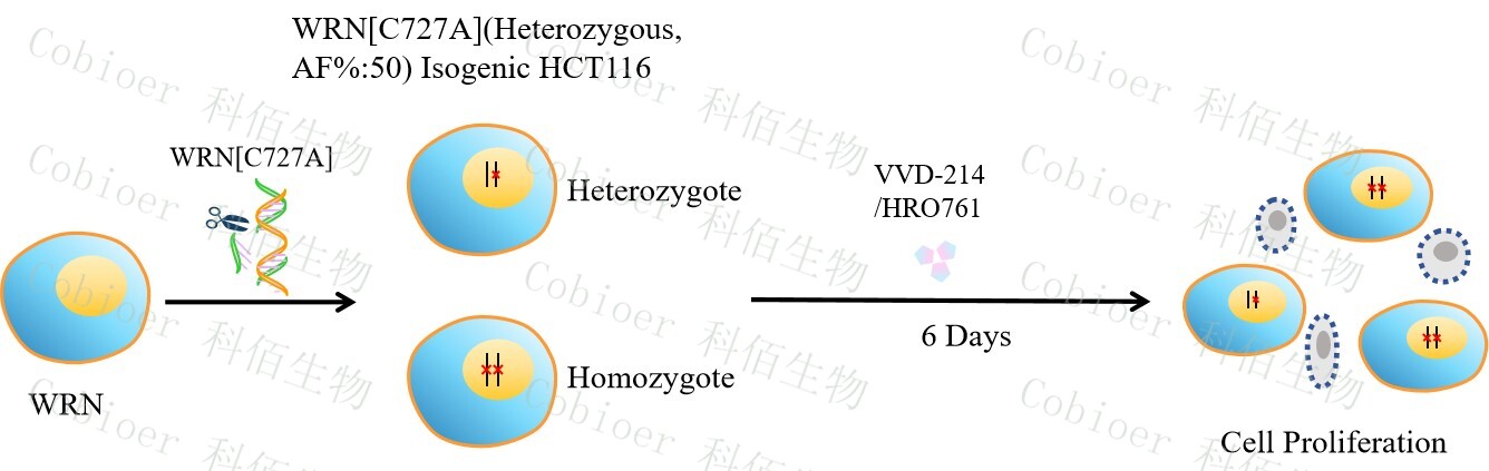 WRN[C727A](Heterozygous,AF%:50) Isogenic HCT116 藥靶細胞,通過(guò)基 因編輯的方式將 WRN 的 727 位氨基酸胱氨酸(C)突變?yōu)楸彼幔ˋ)。![]() Figure 1. WRN[C727A](Heterozygous,AF%:50) Isogenic HCT116 原理示意圖 |