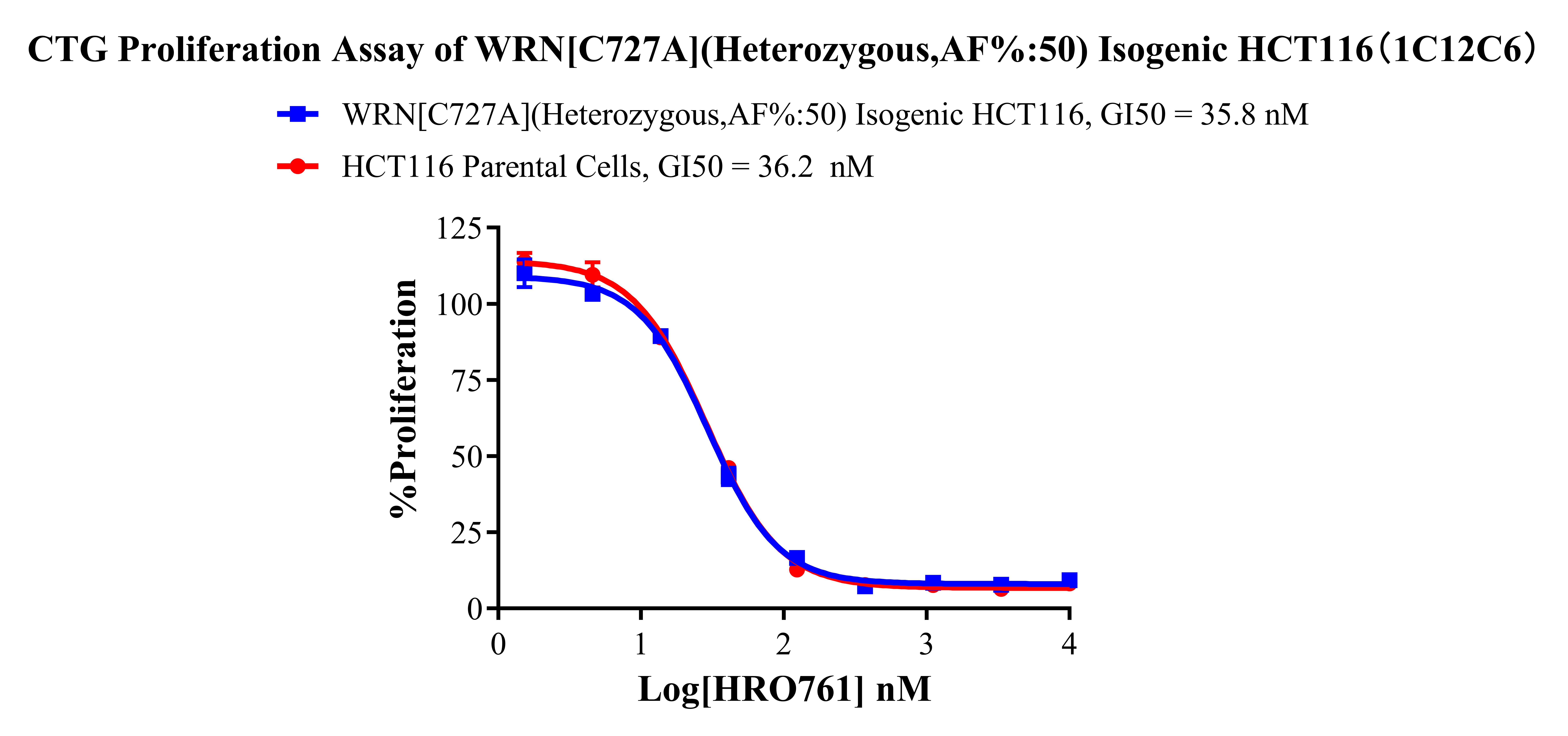 Figure 2. Sanger of WRN[C727A](Heterozygous,AF%:50) Isogenic HCT116![]() Figure 3. A:HCT116 Parental Cell;B:WRN[C727A](Heterozygous,AF%:50) Isogenic HCT116 通道2 藍色微滴代表WRN[C727A]突變陽(yáng)性,通道2 綠色微滴代表該位點(diǎn)為陰性野生型 ![]() Figure 4. CTG Proliferation Assay of WRN[C727A](Heterozygous,AF%:50) Isogenic HCT116(1C12C6). ![]() Figure 5. CTC Proliferation Assay of WRN[C727A](Heterozygous,AF%:50) lsogenic HCT116(1C12C6). |