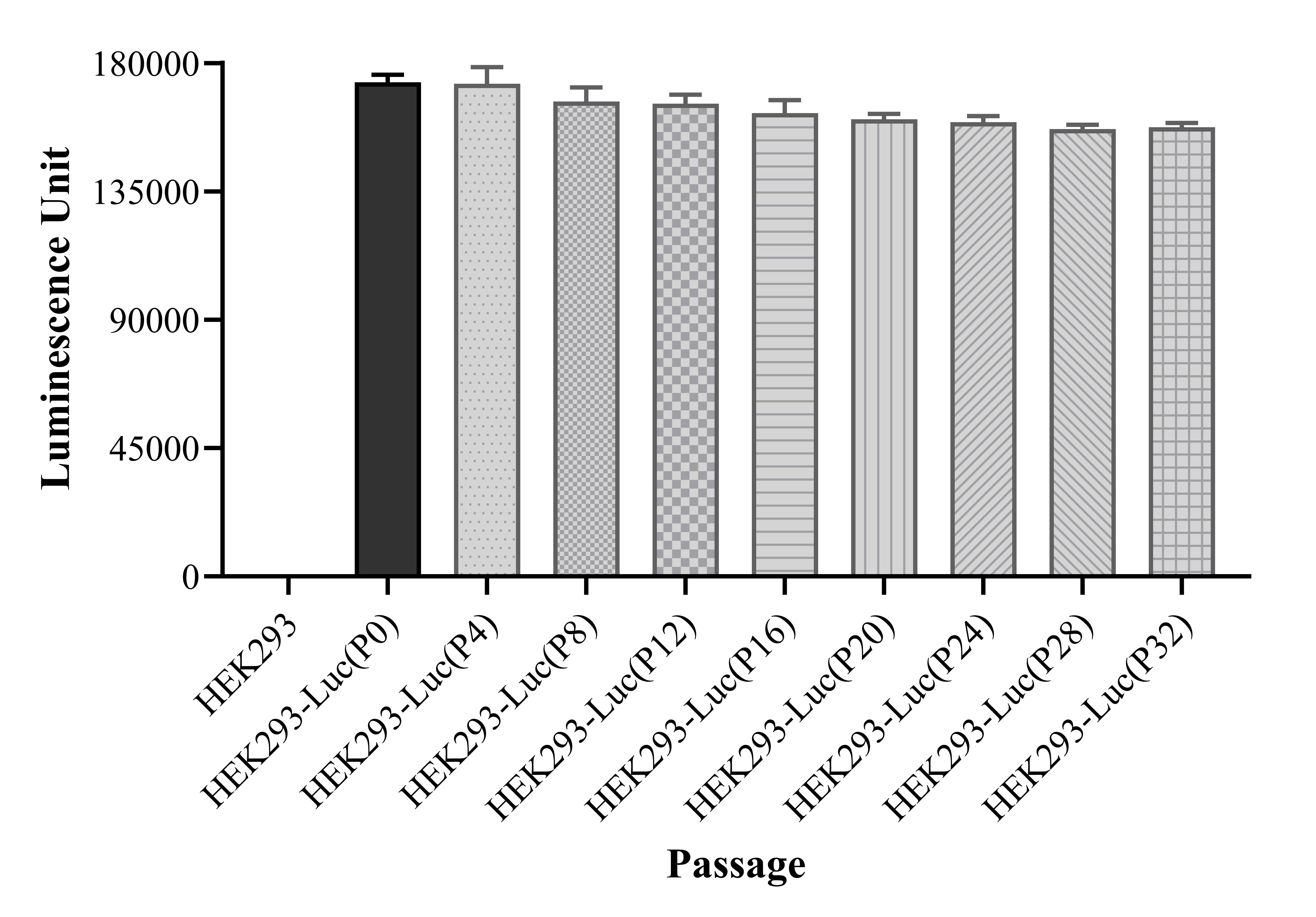 Figure 1. Stablity test results. HEK293-Luc showed at least 32 passage stability with similar luminescence unit. |
