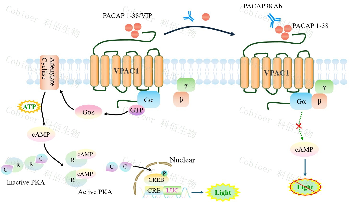 VPAC1 CRE-Luc CHO 報告基因藥靶模型很好的模擬了體內 VPAC1 的信號轉導過(guò)程, 原理見(jiàn)下圖所示。![]() Figure 1. VPAC1 CRE-Luc CHO 細胞模型原理圖 |