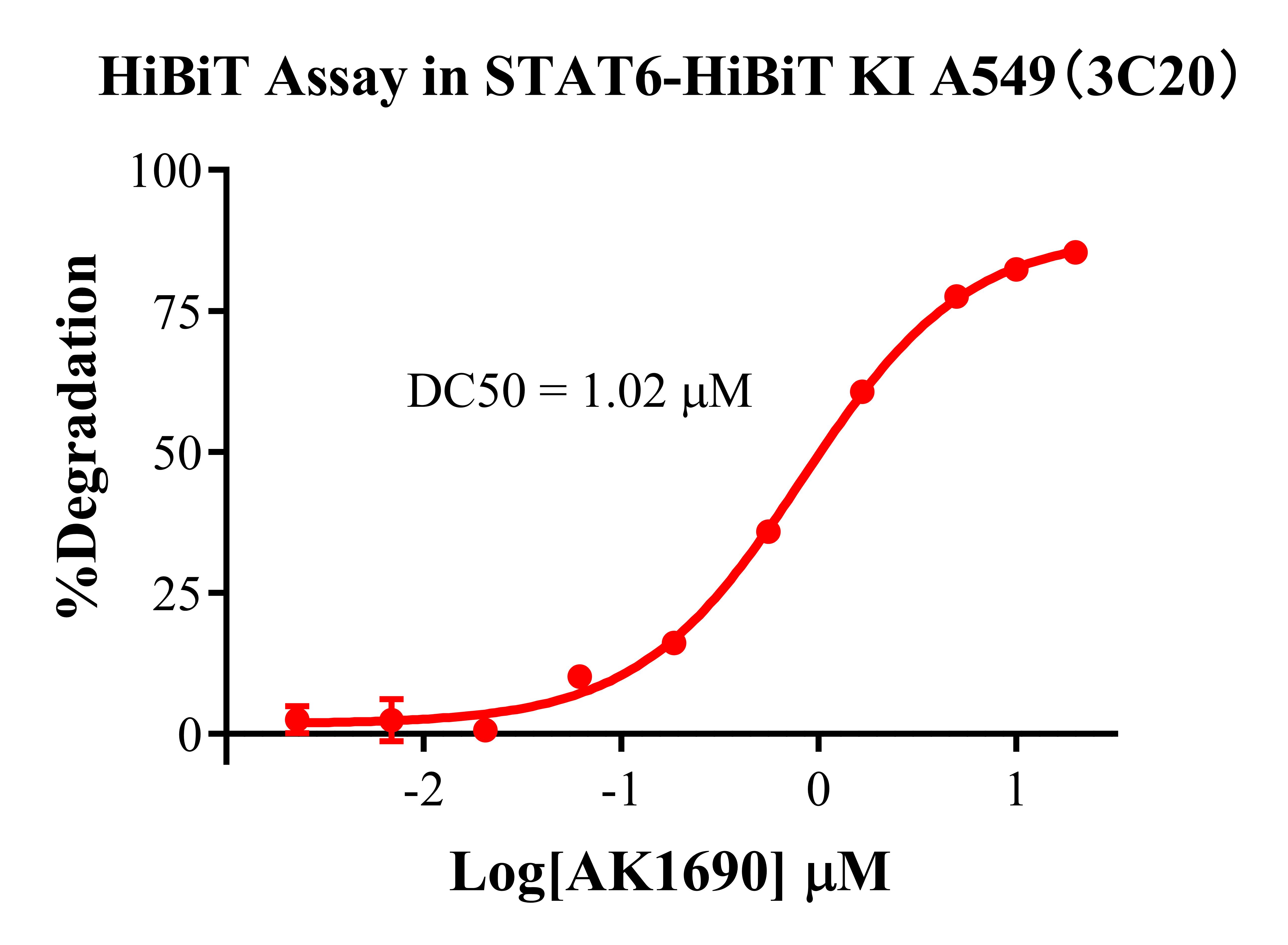 STAT6-HiBiT KI A549 報告基因細胞,通過(guò)基因編輯方式將 HiBiT 標簽 插入細胞內源的 STAT6 基因中。AK-1690 是一種有效和選擇性的 STAT6 PROTAC 降解劑, 原理見(jiàn)下圖所示。![]() Figure 1. STAT6-HiBiT KI A549 細胞模型原理圖 |
