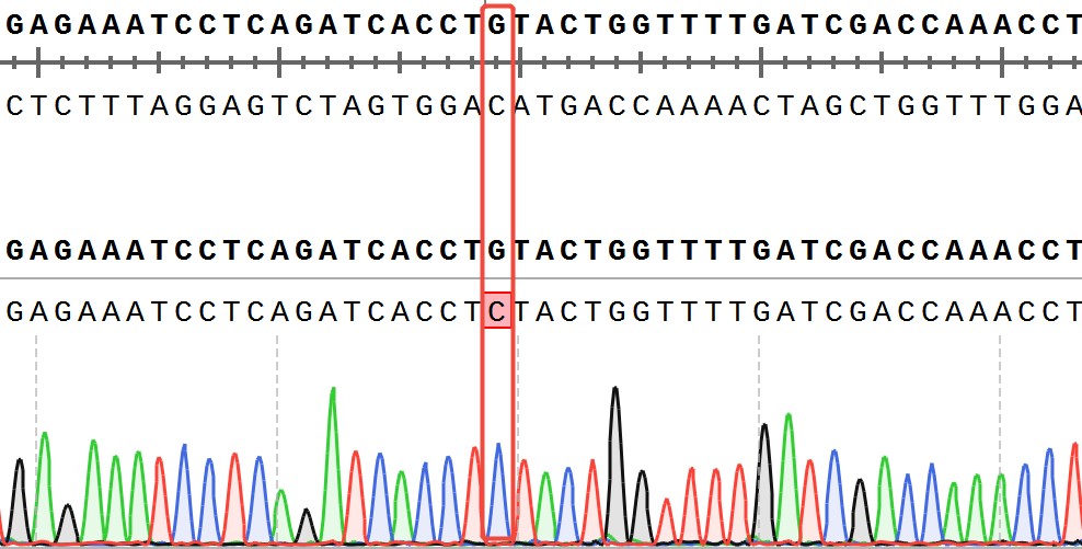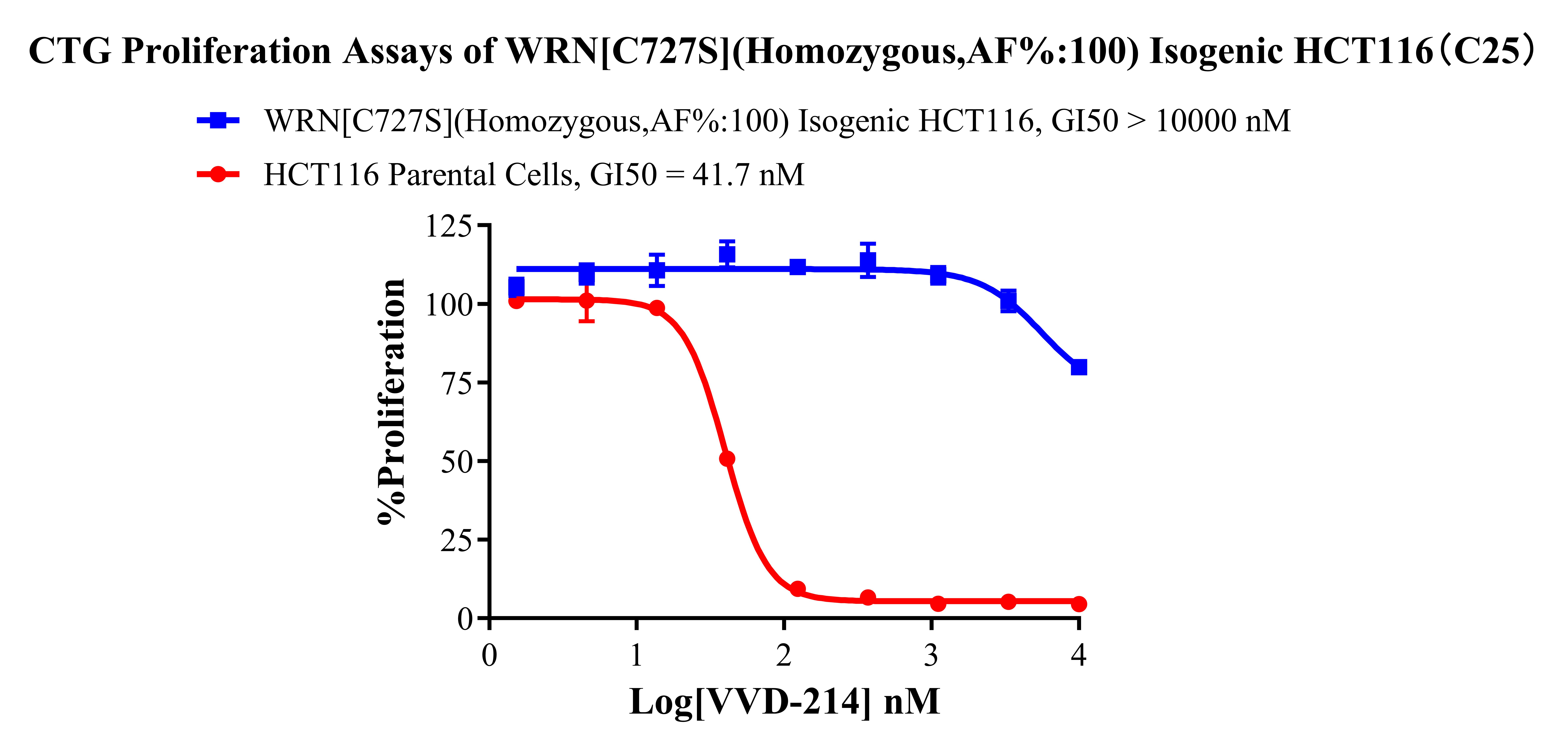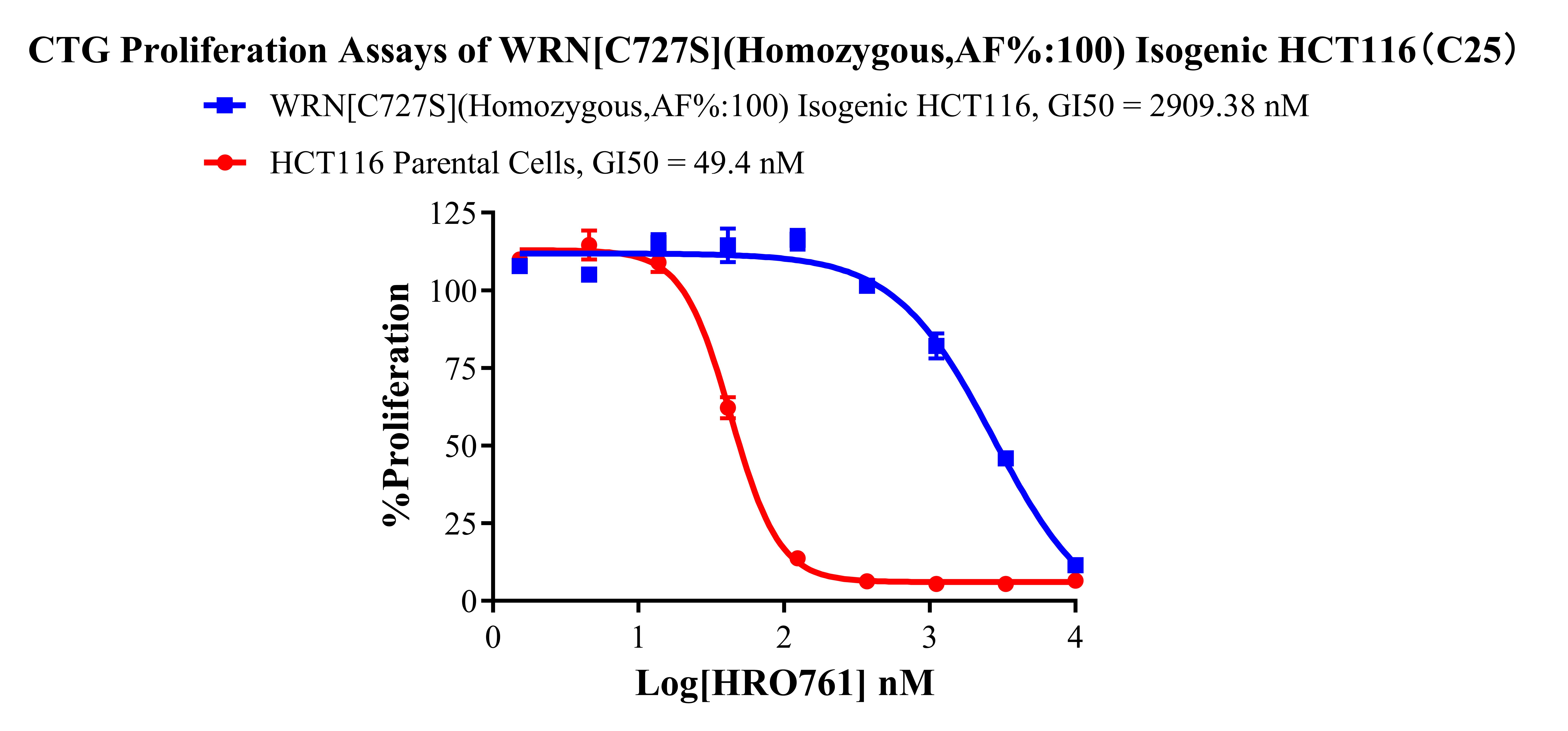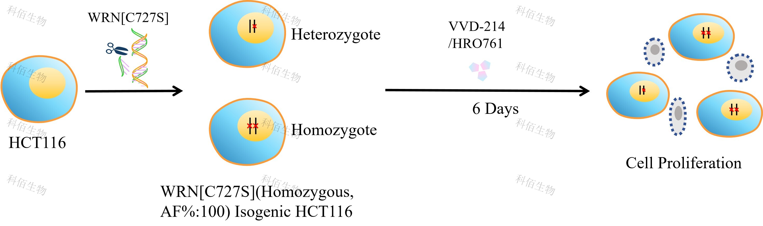 WRN[C727S](Homozygous,AF%:100) Isogenic HCT116 藥靶細胞,通過(guò)基因編輯的方式將 WRN 的 727 位氨基酸胱氨酸(C)突變?yōu)榻z氨酸(S)。![]() Figure 1. WRN[C727S](Homozygous,AF%:100) Isogenic HCT116 原理示意圖 |