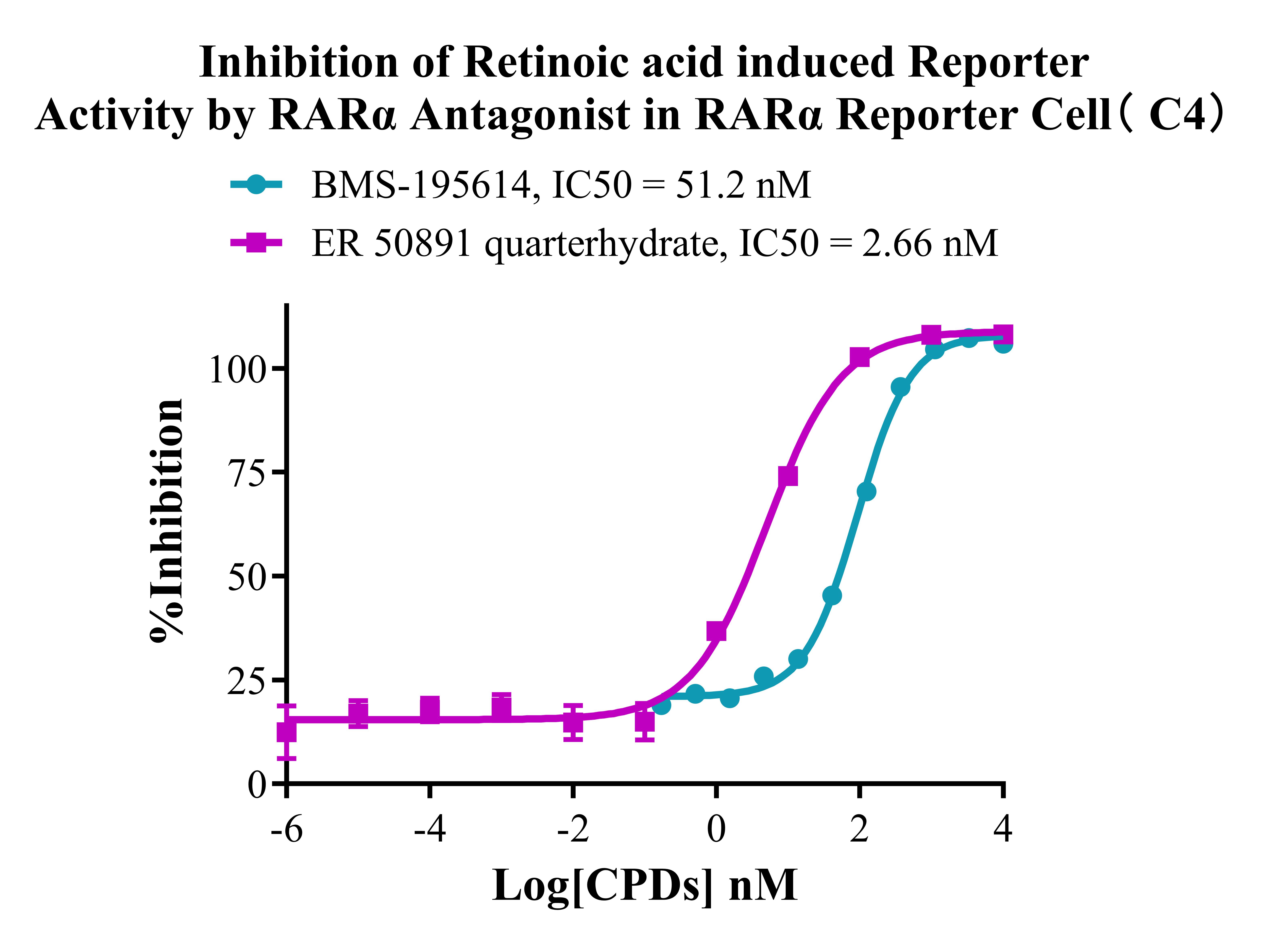 RARα Reporter Cell 報告基因細胞,在由調控因子調控并表達報告基因的重組細胞上,穩定表達人 RARα。Retinoic acid 是 RAR 核受體的天然激動(dòng)劑,原理見(jiàn)下圖所示。![]() Figure 1. RARα Reporter Cell 細胞原理示意圖 |