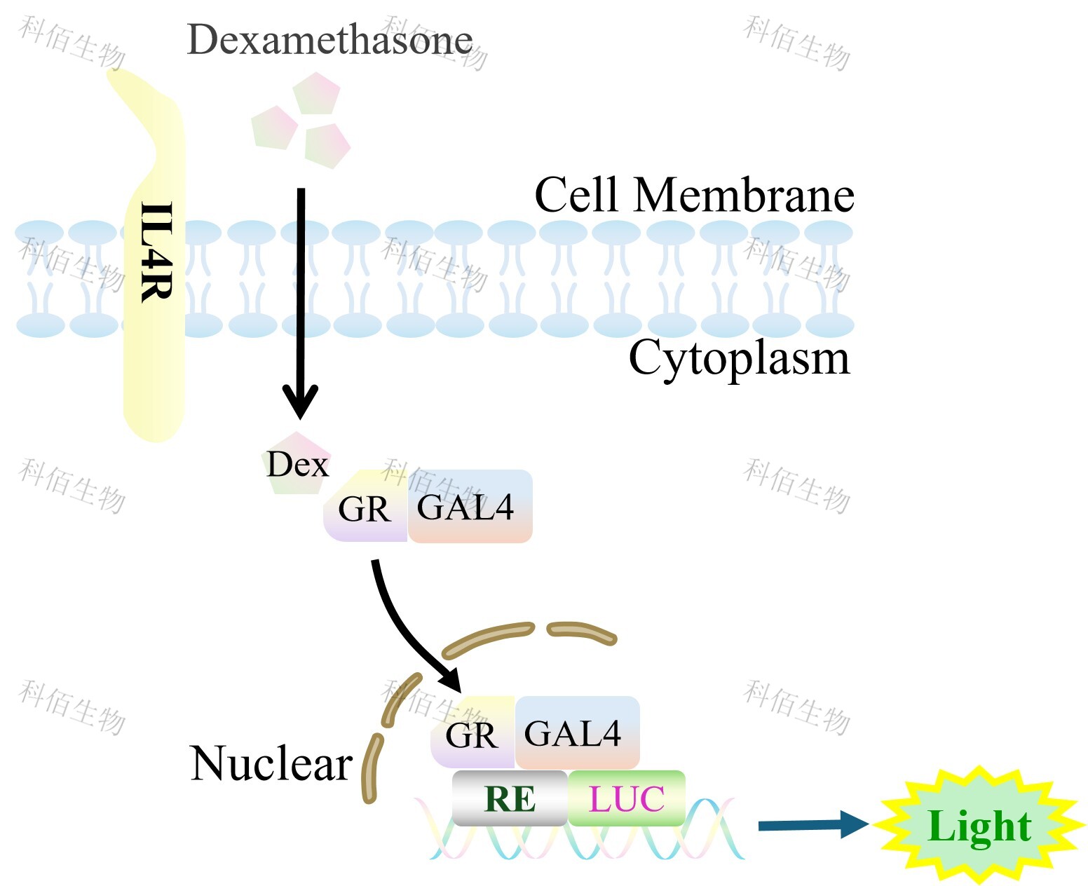IL4R(High expression)&GR-GAL4 Luciferase Reporter HEK293 報告基因細胞,是在 GR-GAL4 Luciferase Reporter HEK293 重組細胞上過(guò)表達人的 IL4R。Dexamethasone (Hexadecadrol,地塞米松)是糖皮質(zhì)激素受體 (Glucocorticoid Receptor)激動(dòng)劑、凋亡誘導劑,原理見(jiàn)下圖所示。![]() Figure 1. IL4R(High expression)&GR-GAL4 Luciferase Reporter HEK293 細胞原理示意圖 |