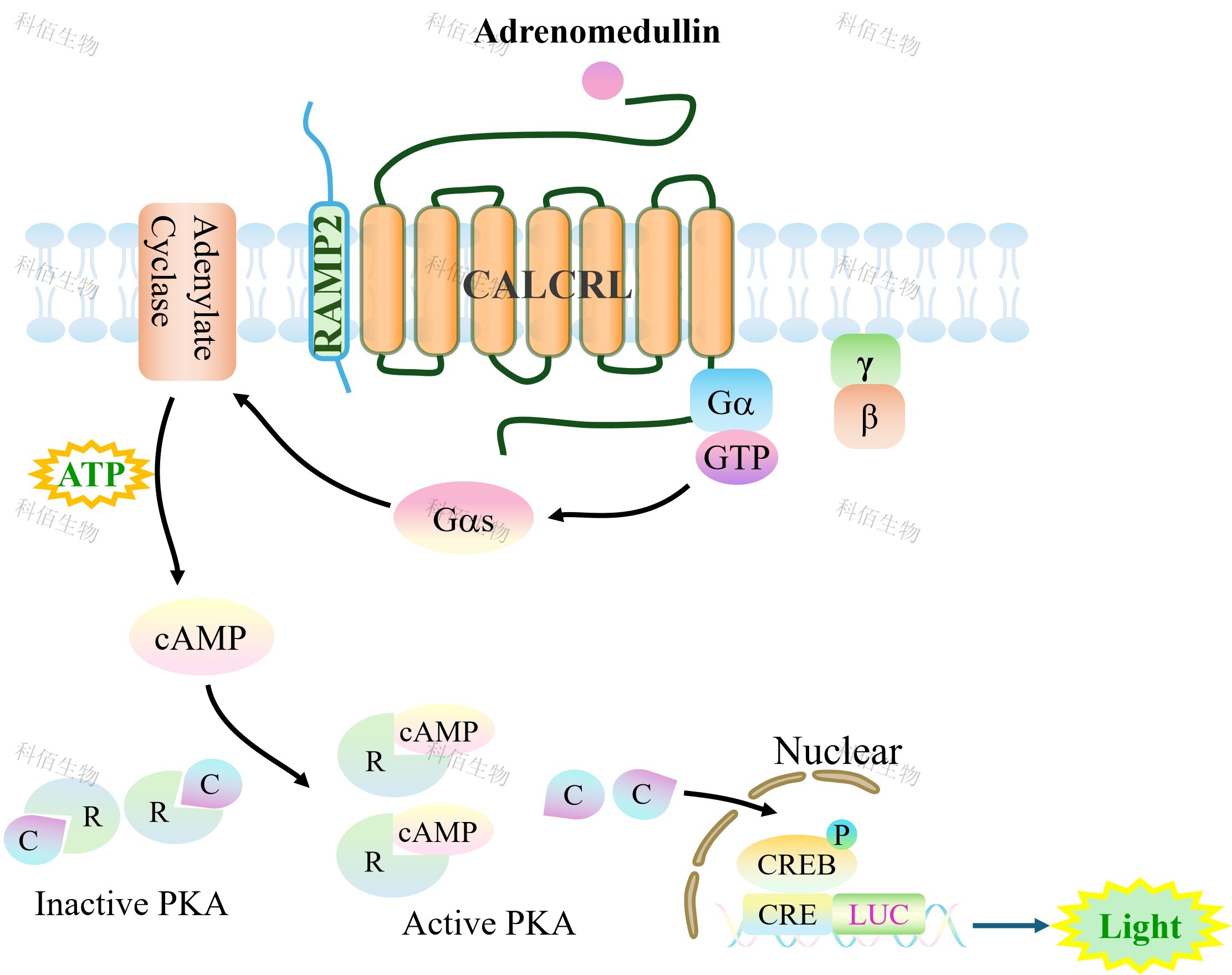 CALCRL&RAMP2 CRE-Luc HEK293 報告基因靶模型很好的模擬了體內 Adrenomedullin 的信號轉導過(guò)程,原理見(jiàn)下圖所示。