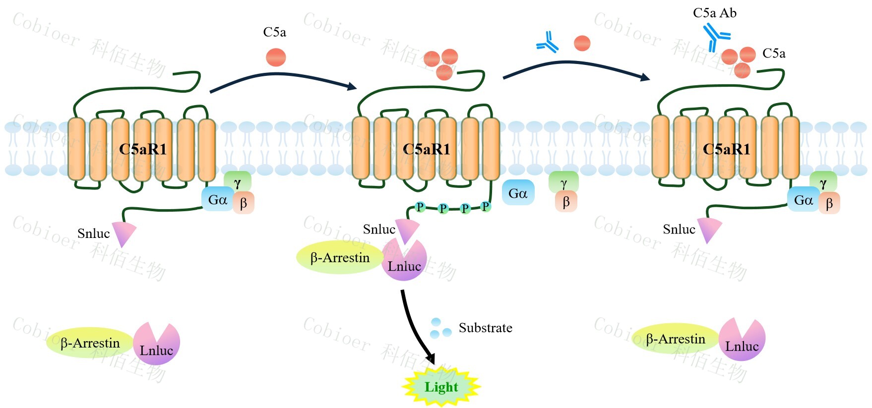 C5aR1 β-Arrestin CHO 報告基因藥靶模型很好的模擬了體內 C5aR1/β-Arrestin 的信號轉導過(guò)程,原理見(jiàn)下圖所示。![]() Figure 1. C5aR1 β-Arrestin CHO 細胞模型原理圖 |