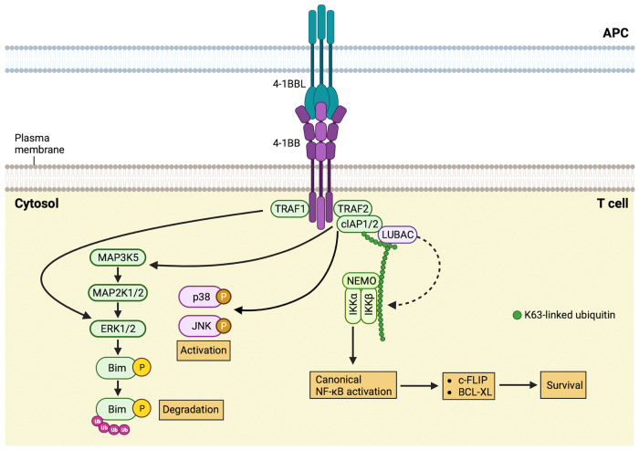 4-1BB的配體是4-1BBL(也稱(chēng)為T(mén)NFSF9或CD137L)。4-1BBL是TNF超家族的II型膜蛋白。在與抗原呈遞細胞(APC)上的 4-1BBL 相互作用后,4-1BB 信號傳導首先將TRAF1和TRAF2與cIAP1和cIAP2一起募集到位于 4-1BB 細胞質(zhì)尾部的 TRAF 結合基序,形成 4-1BB 信號復合物。TRAF1 和 TRAF2 通過(guò) TRAF1 刺激 ERK1/2 活性導致 ERK1/2 激活。ERK1/2 的激活還誘導促細胞凋亡蛋白 Bim 的磷酸化,使Bim的蛋白酶體降解,進(jìn)而促進(jìn)了 T 細胞存活。在 4-1BB 誘導的 NF-κB 激活的背景下,TRAF2-cIAP 復合物啟動(dòng) NF-κB 通路。IKK 復合物由三個(gè)亞基組成:兩個(gè)激酶 IKKα 和 IKKβ,以及調節亞基 NF-κB 必需調節劑 (NEMO;也稱(chēng)為 IKKγ)。NF-κB誘導BCL-XL、BCL-2和c-FLIP的轉錄,刺激IL-2、IL-4和IFN-γ的表達,促進(jìn)T細胞的存活和細胞毒性活性。此外,TRAF2 募集促進(jìn) JNK 和 p38 MAPK 通路的激活。JNK 易位到細胞核中,與轉錄因子 JUN 和 ATF2 相互作用,導致 T 細胞產(chǎn)生 IL-2、IL-4 和 IFN-γ。