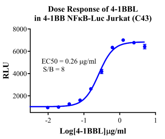 Figure 8. Detect Luciferase assay by Ultra Luciferase Detection Kit CBPH0001(we strongly suggest to purchase from Cobioer). Dose Response of 4-1BBL in 4-1BB NFκB-Luc Jurkat (C43).