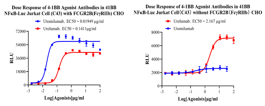 為助力4-1BB靶點(diǎn)藥物研發(fā),我們開(kāi)發(fā)了41BB/CHO、41BB/HEK293、41BB/NFκB-Luc/HEK293、41BB/NFκB-Luc/Jurkat和4-1BBL CHO細胞篩選模型,產(chǎn)品驗證結果如下: